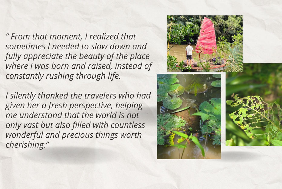 I’m originally from Hanoi. I studied piano for all my childhood then quit and studied abroad in the Netherlands in tourism for one year, then came back to Vietnam, lived in Hoi An for a few months, and later moved to Ben Tre, where I’ve been living since 2022. Studying abroad and living in different parts of Vietnam helped opening my mind to many new things: lifestyles, cultures, people. Now, living in the Mekong delta has been so fun, interesting, easy and not easy at the same time for me. The cultures, people's accent here is very different from the North. It takes time for me to blend in here and to make friends with people surround me.