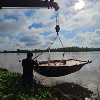 We designed the boat ourselves with a big help from the boat wood carpenter in the North Vietnam. They carved the sailboat for us and delivered all the way to the South to us.