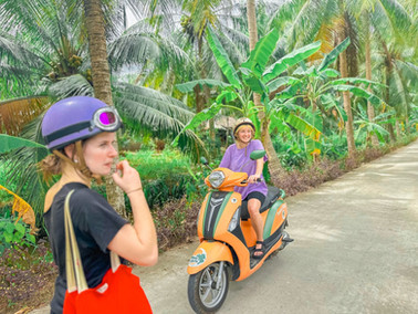 Sometimes we organize tuk-tuks instead of scooters. Tuk-tuks are three-wheeled vehicles that local people mostly use to transport goods like coconuts, durian, furniture, or construction materials—and yes, they can carry people too :D. It’s a fun, bumpy, and very breezy experience.